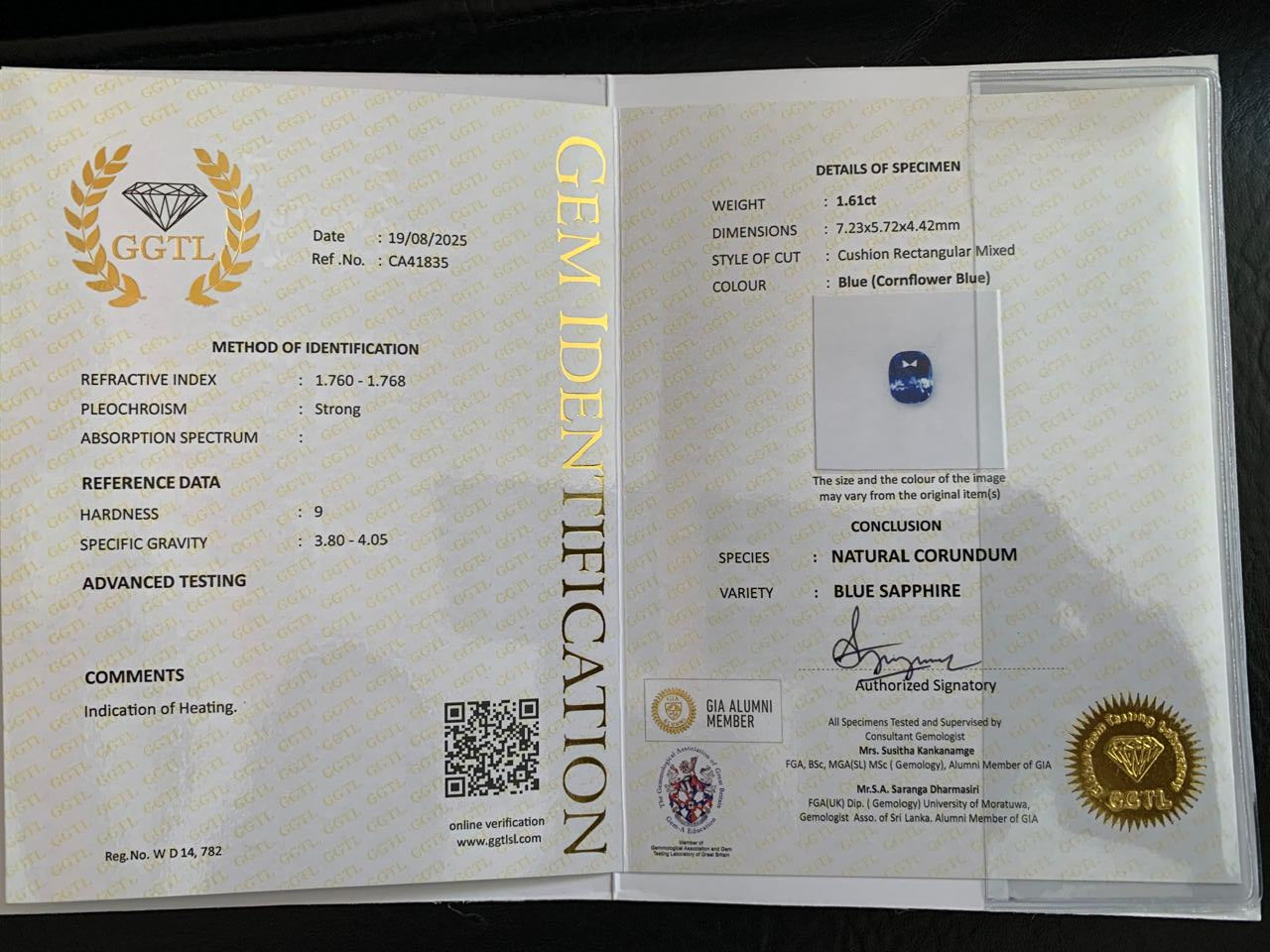 This exceptional 1.61-carat cornflower blue sapphire represents the pinnacle of Ceylon sapphire quality. The coveted cornflower blue hue, combined with VVS1 clarity, makes this gemstone extraordinarily rare and valuable. The cushion cut maximizes the stone's brilliance and showcases the mesmerizing blue color that has made Ceylon sapphires world-famous.